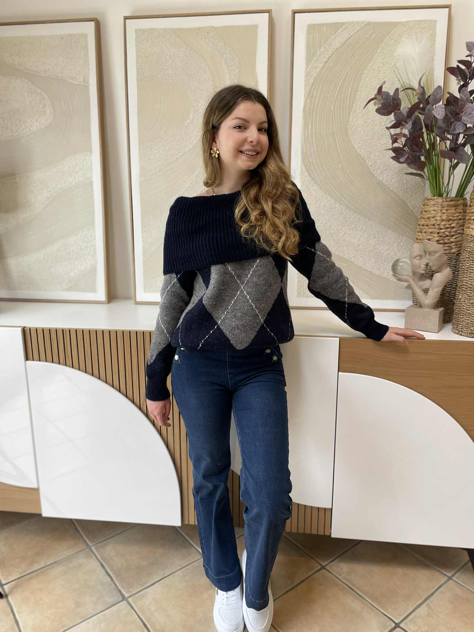 Pull col barbot bleu marine et losange.
