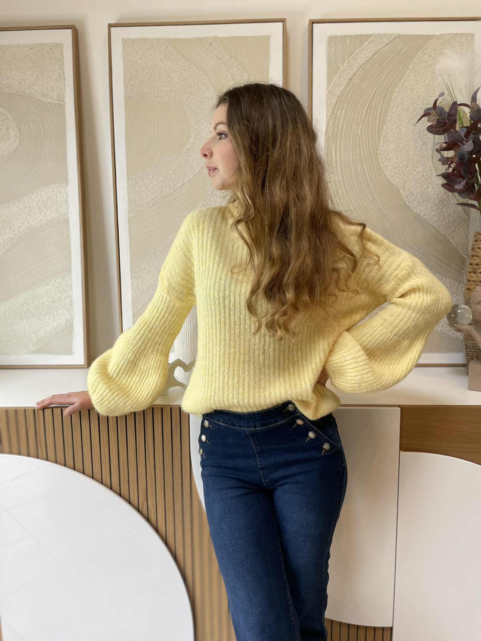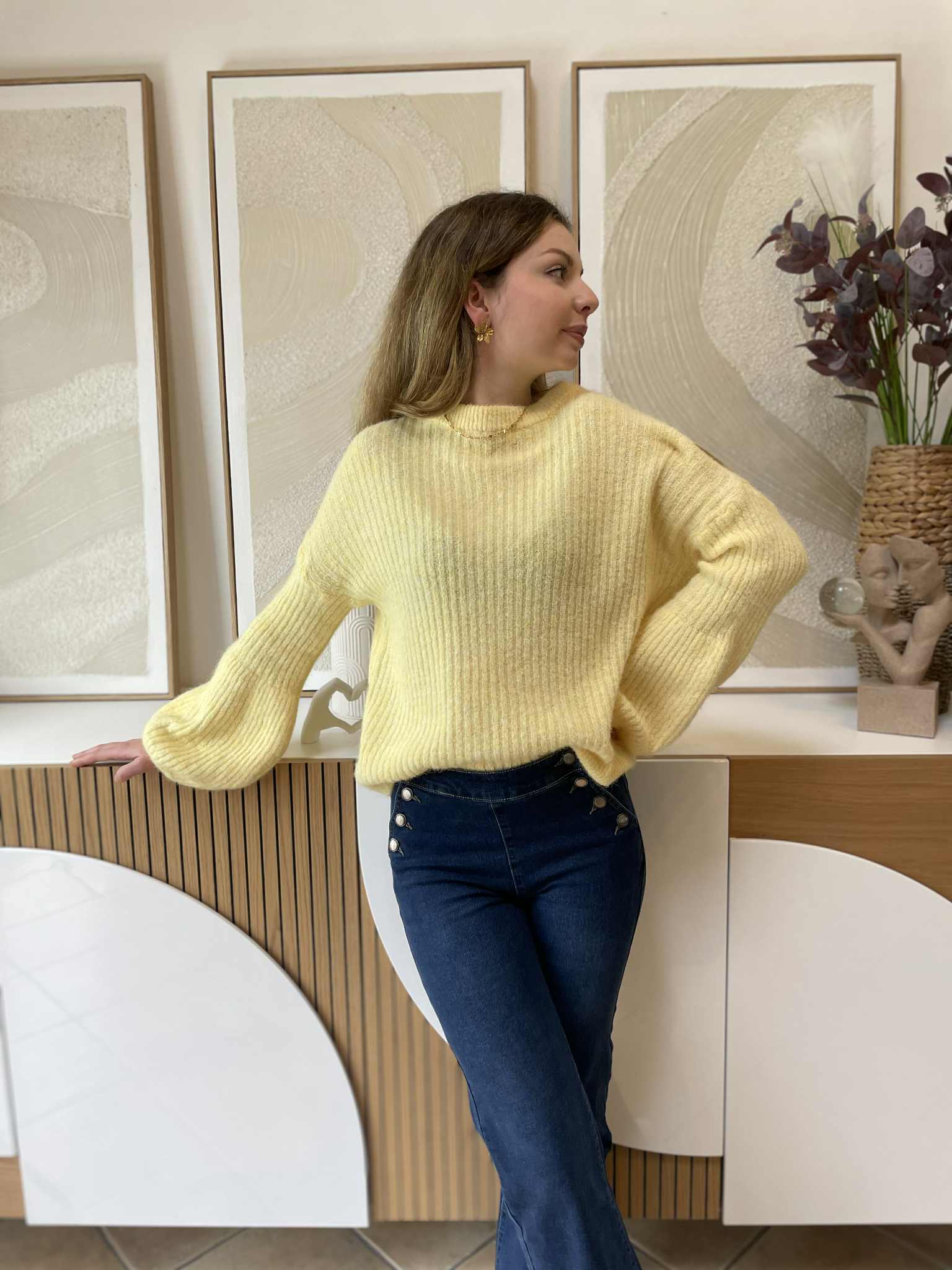 Pull jaune, maille très douce, bouts de manches évasé.